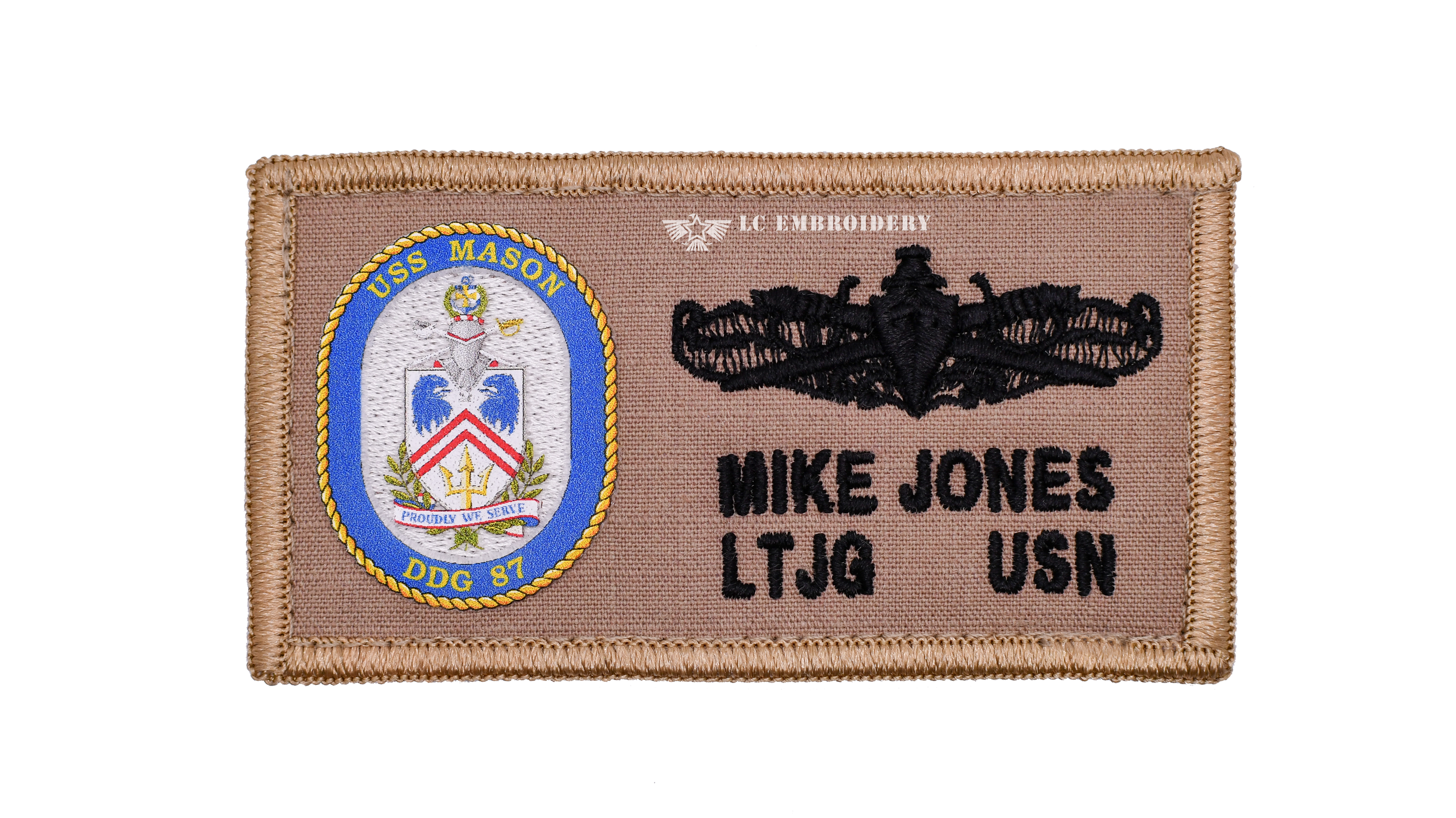 A 2 x 4 standard 2POC patch. The USS MASON DDG 87 can be used on the Khaki 2POC uniform.