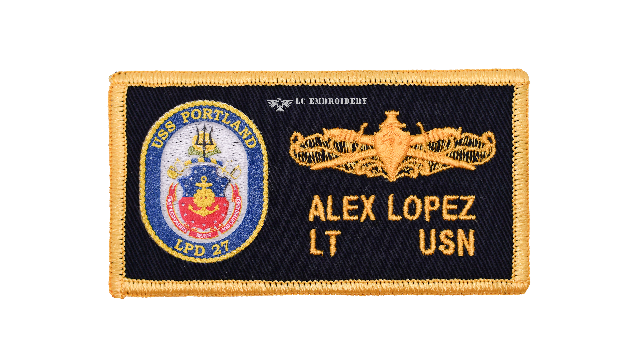 Bulwark navy blue with crest USS PORTLAND LPD 27 cloth name patch, 2" x 4" inches with Velcro included.